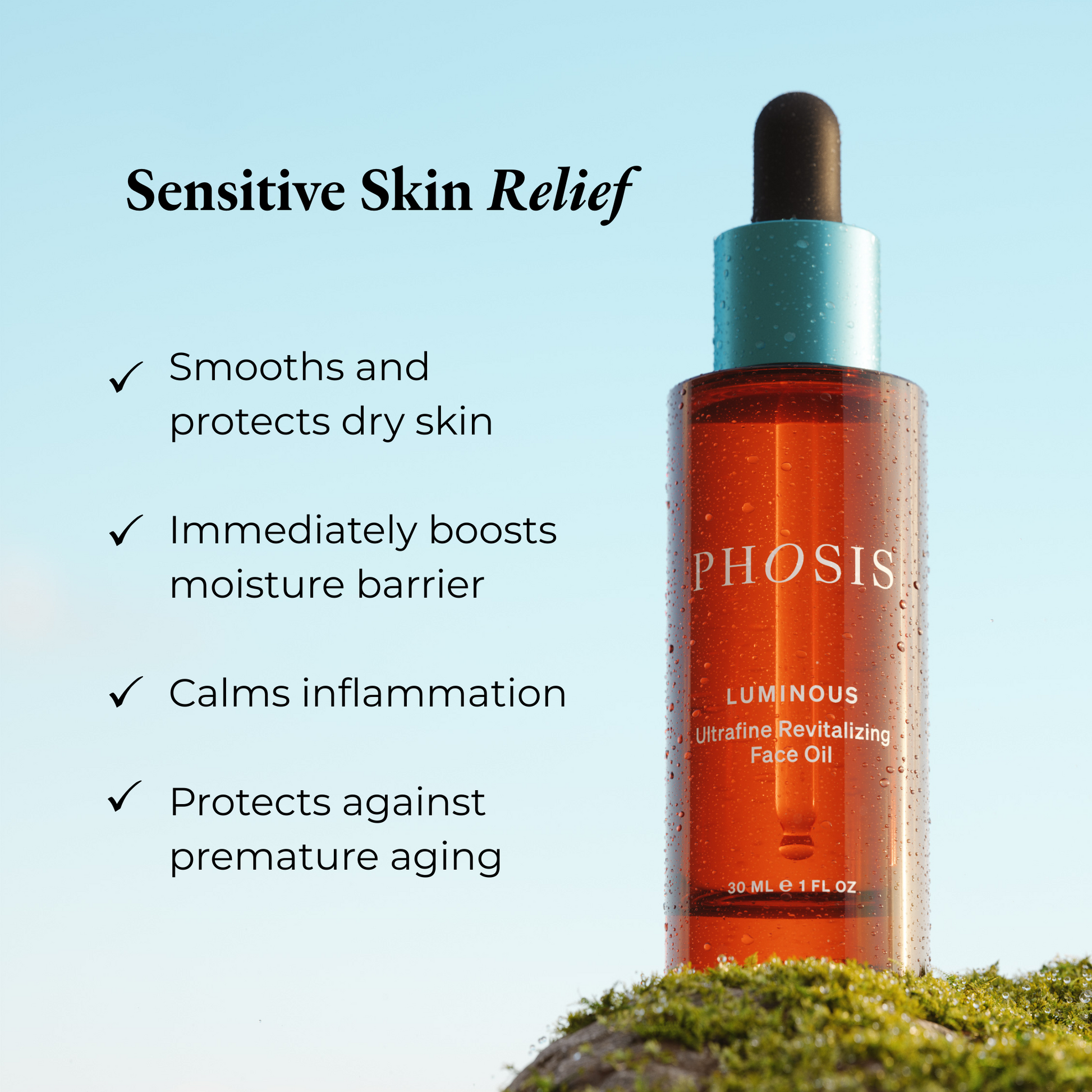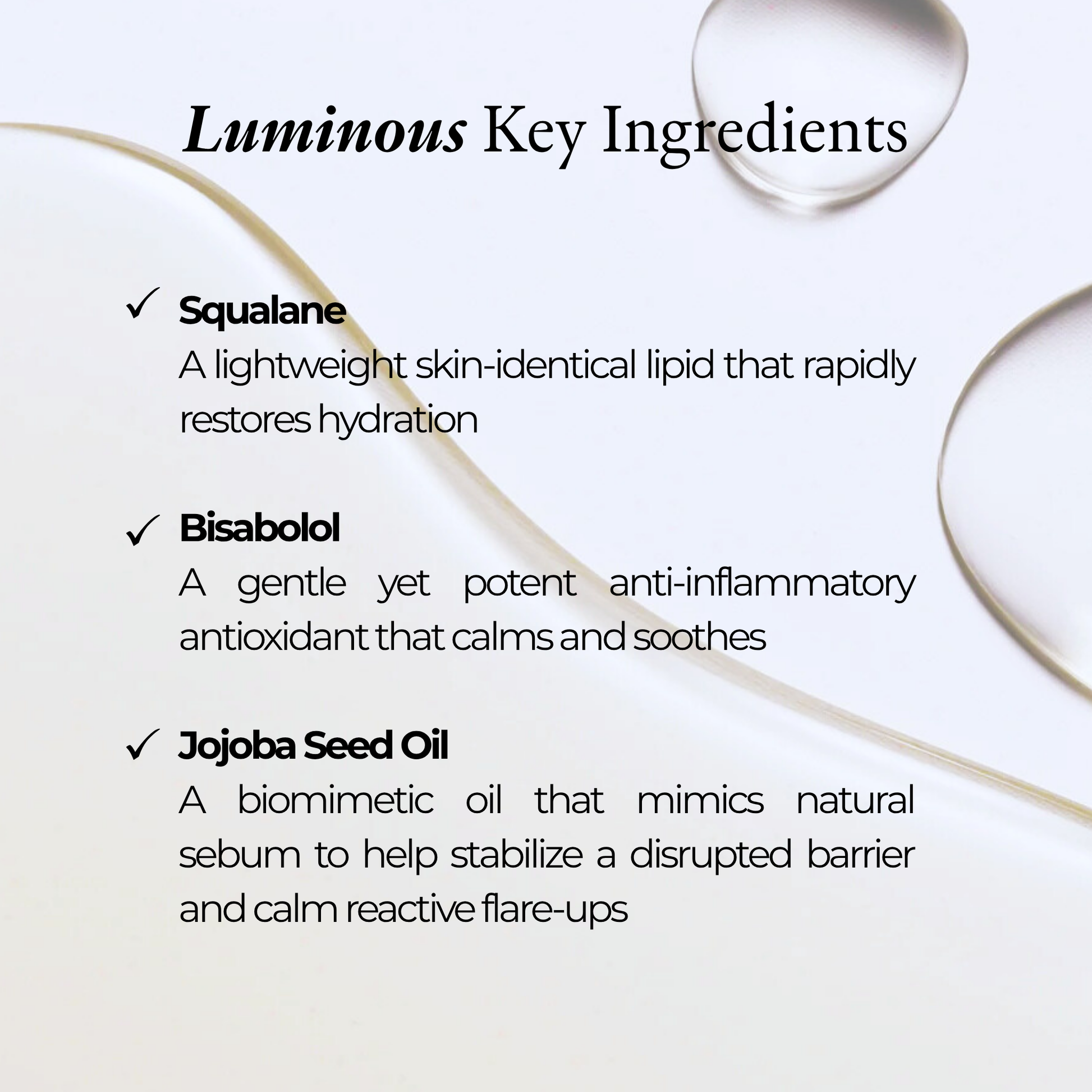 A lightweight, clinically-tested face oil that locks in moisture, reinforces the skin barrier, and supports sensitive and hormonally affected skin without heaviness. Luminous absorbs quickly, leaving skin replenished and healthy.