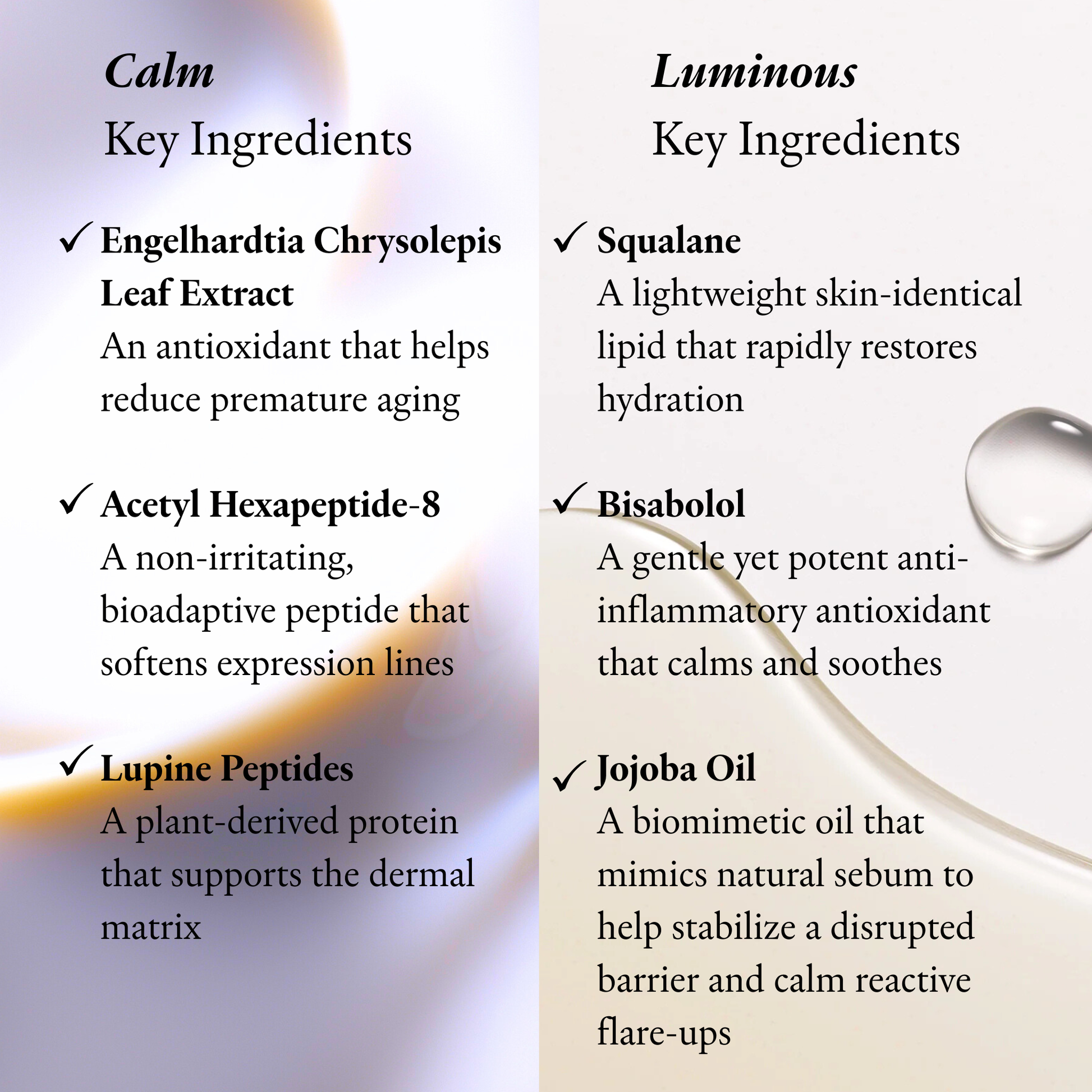 Calm: Water (Aqua), Cetearyl Alcohol, Propanediol, Caprylic/Capric Triglyceride, Coco-Caprylate, Simmondsia Chinensis (Jojoba) Esters, Glycerin, Limnanthes Alba (Meadowfoam) Seed Oil, Glyceryl Stearate, Ruttnera Lamellosa Oil, Watanabea Reniformis Oil, Hydrolyzed Lupine Protein, Engelhardtia Chrysolepis Leaf Extract, Hydrolyzed Rhodophycea (Red Algae) Extract, Tuber Magnatum (White Truffle) Extract, Acetyl Hexapeptide-8, Tocopherol, Linoleic Acid, Phytosterols, Phospholipids, Bisabolol, Zingiber Officinale (Ginger) Root Extract, Aloe Barbadensis Leaf (Aloe) Juice, Ceramide NP, Ectoin, Glyceryl Behenate/Eicosadioate, Helianthus Annuus (Sunflower) Seed Wax, Sodium Stearoyl Glutamate, Polyglycerin-3, Helianthus Annuus (Sunflower) Seed Oil, Helianthus Annuus (Sunflower) Extract, Oryza Sativa (Rice) Bran Extract, Rosmarinus Officinalis (Rosemary) Leaf Extract, Cetyl Hydroxyethylcellulose, Xanthan Gum, Acacia Senegal Gum, Sodium Gluconate, Sodium Benzoate, Potassium Sorbate, Sodium Phytate, Lecithin, Caprylhydroxamic Acid, Caprylyl Glycol, Citric Acid